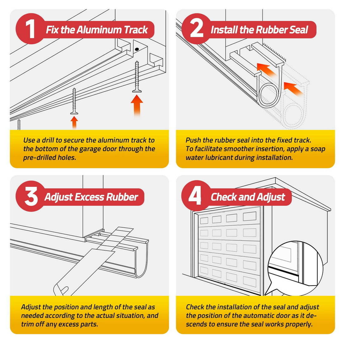 Easy to install: The aluminum rails come with pre-drilled screw holes, you can easily fix the rails to the bottom of the garage door with screws and install the sealing strips on the aluminum rails. You can cut off the excess according to the length of the door.