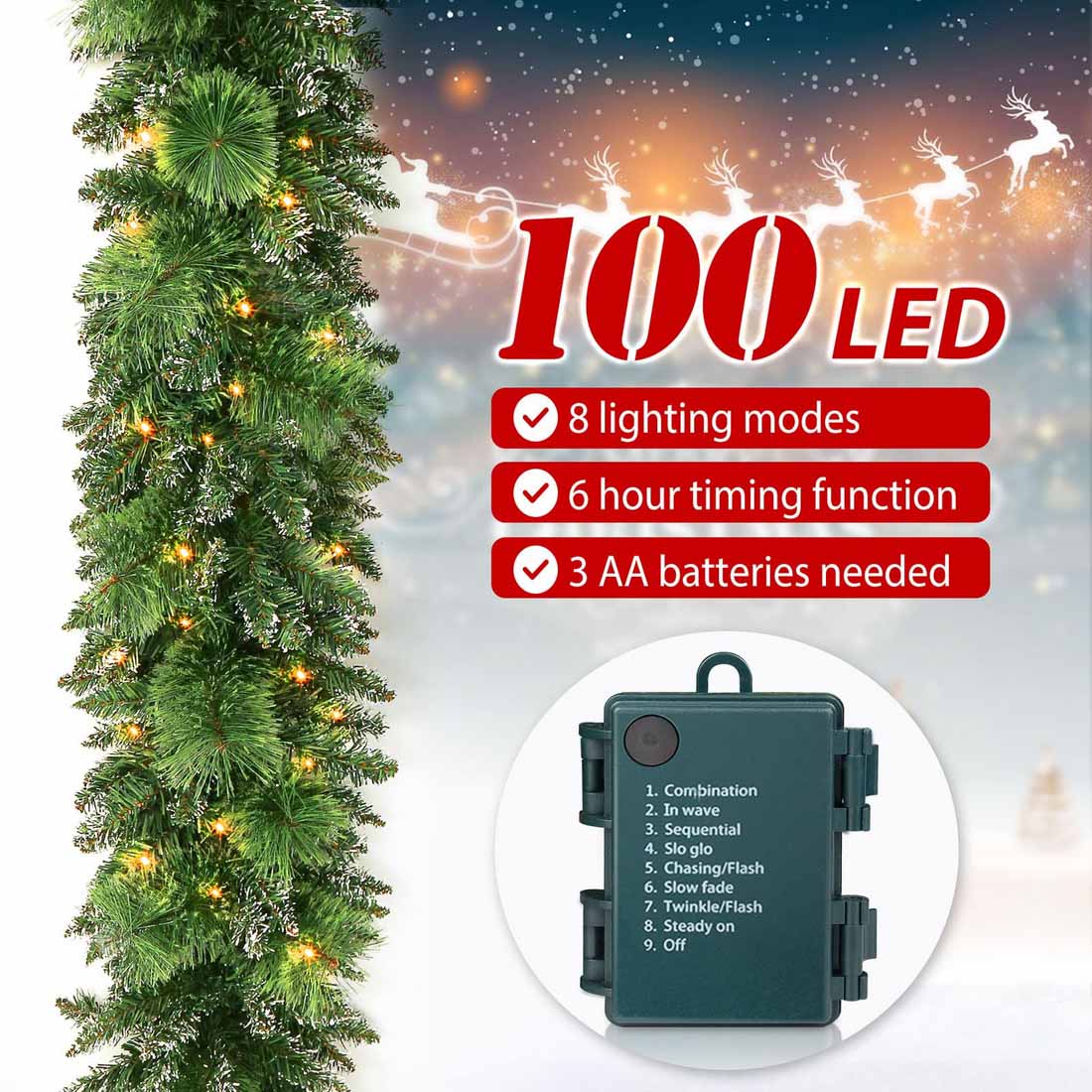 ¡¾8 Modes /3 AA Batteries Box¡¿- The prelit Christmas garlands has 8 modes 3 AA batteries box operated - combination, chase, slow attenuation, flash, sequence, slow light,wave, stability.(AA batteries which are not included).