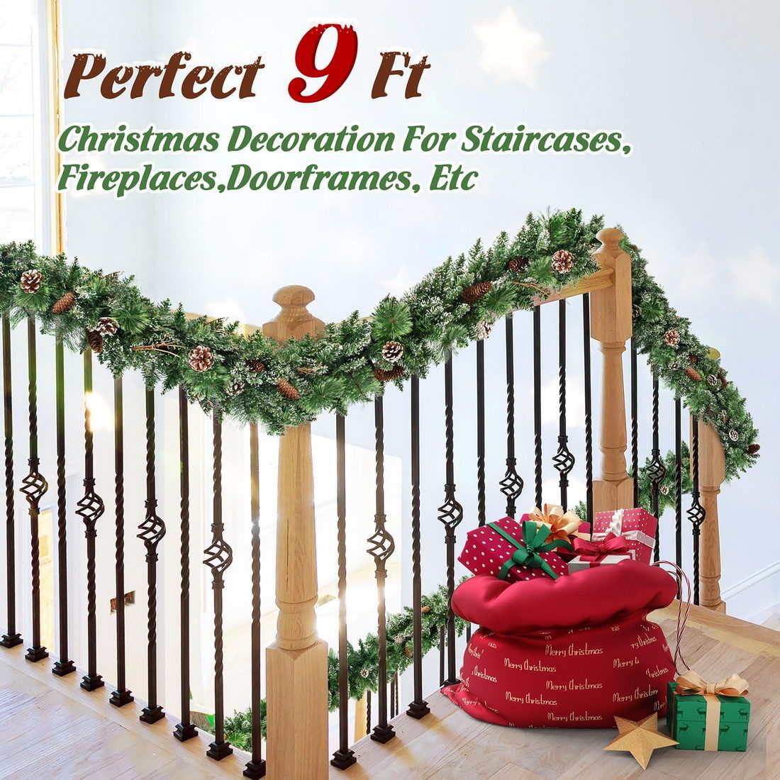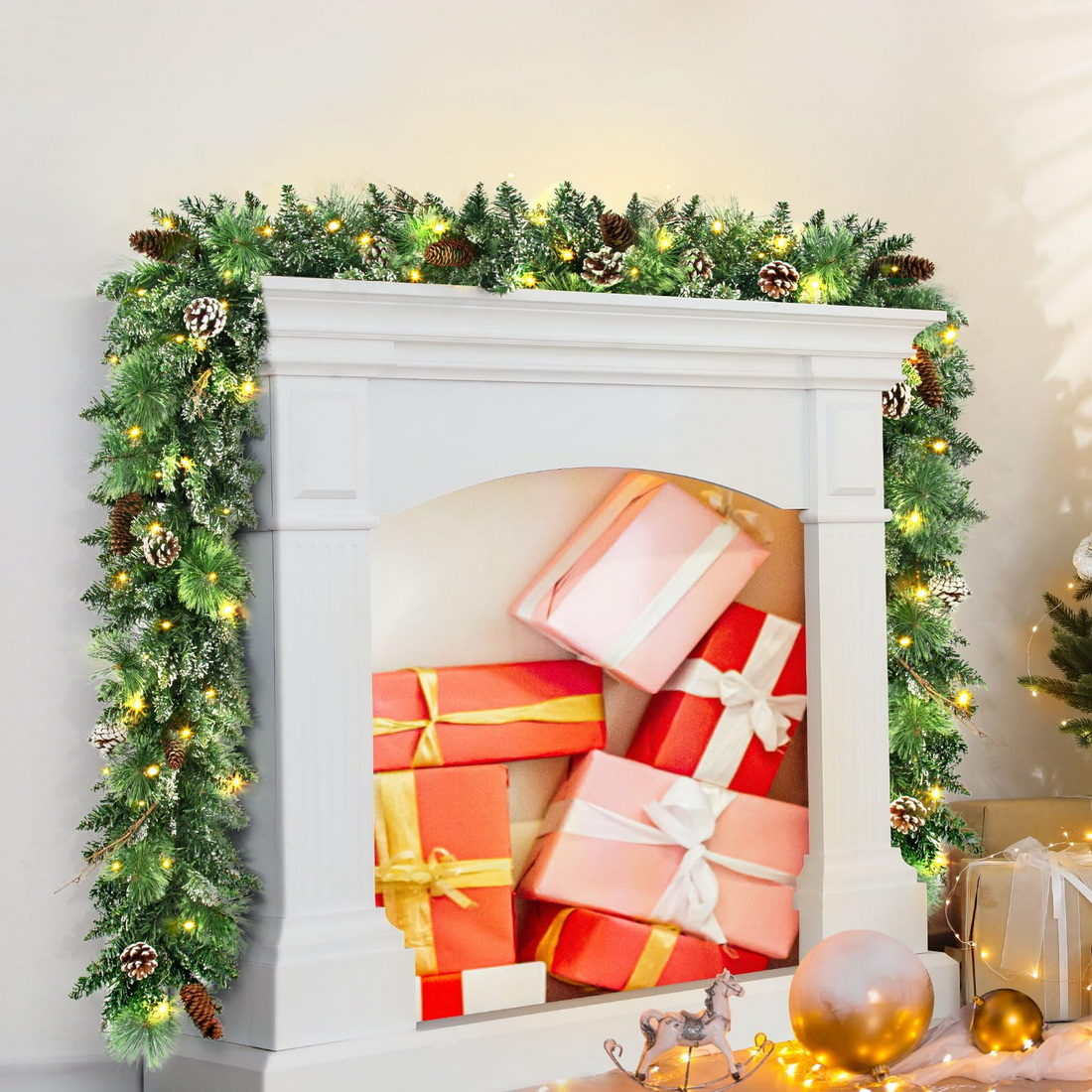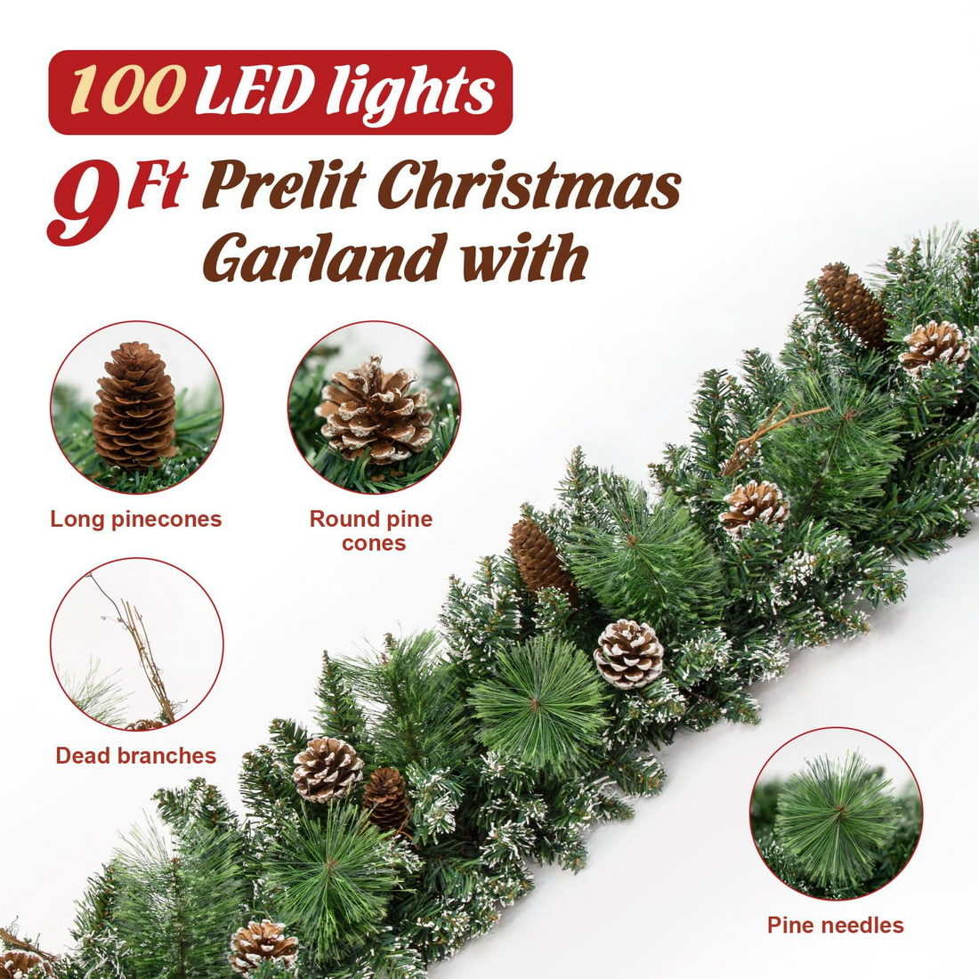 9FT/100 Light Christmas Garlands: We used a variety of pine cones, branches, cedars and other leaves to decorate this 9FT/100 light Christmas Garland to ensure that it looks rich and beautiful.When you take out the product from the package, please handle the branches and leaves with your hands, which have been compressed by the package before.