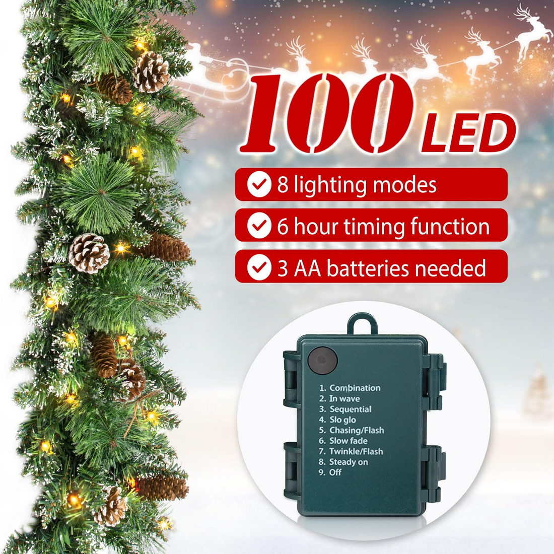 8 Modes /3 AA Batteries Box: The prelit Christmas garlands has 8 modes 3 AA batteries box operated - combination, chase, slow attenuation, flash, sequence, slow light,wave, stability.(AA batteries which are not included).