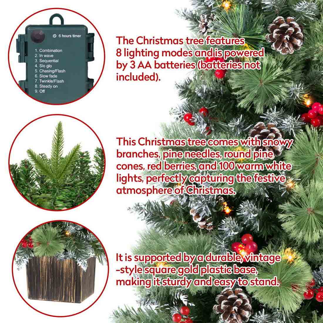 8 Modes and 3 AA Batteries Box: The Christmas tree comes with 100 warm white lights and 8 lighting modes. It operates with a waterproof 3 AA battery box, offering modes like combination, chasing, slow fade, twinkle, sequential, slow glow, waves, and steady on. (AA batteries not included).