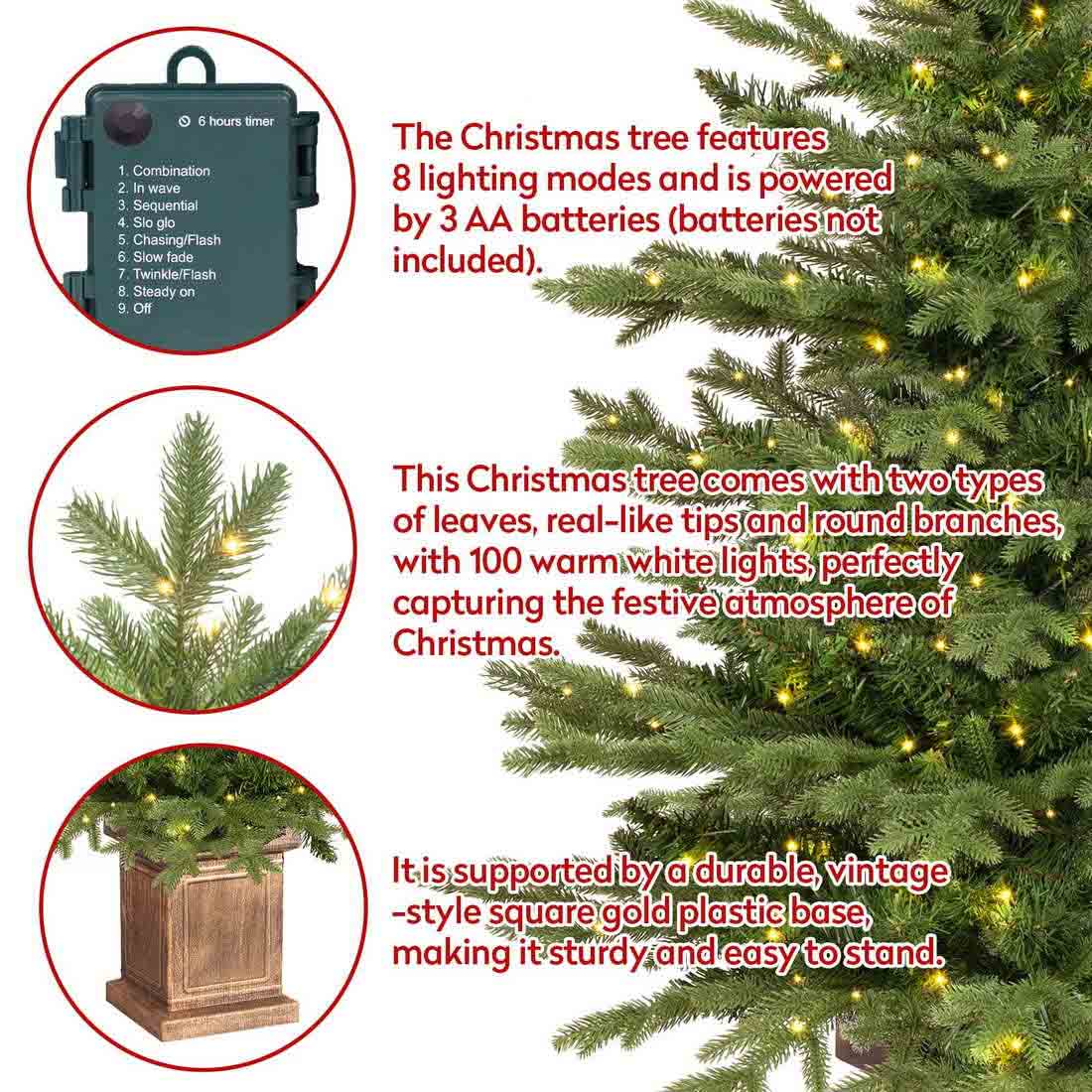 8 Modes and 3 AA Batteries Box: The Christmas tree comes with 100 warm white lights and 8 lighting modes. It operates with a waterproof 3 AA battery box, offering modes like combination, chasing, slow fade, twinkle, sequential, slow glow, waves, and steady on. (AA batteries not included).